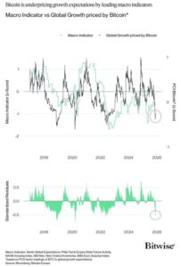 نمودار، واگرایی شدید را نشان می‌دهد؛ خط سیاه که نشان‌دهنده چشم‌انداز رشد ضمنی بیت‌کوین است، به زیر انحراف معیار منفی یک سقوط کرده که به طور قابل توجهی بدبینانه‌تر از شاخص کلان مبتنی بر نظرسنجی و حدود خنثی مانده است. به گفته دراگوش، این وضعیت شبیه به نوسانات گذشته مانند مارس ۲۰۲۰ و نوامبر ۲۰۲۲ است، درست قبل از اینکه بیت‌کوین افزایش قیمت‌های بزرگی را تجربه کند.