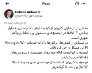 در همین ارتباط بهزاد اکبری، معاون وزیر ارتباطات و مدیرعامل شرکت ارتباطات زیرساخت امروز یکشنبه – در صفحه شخصی خود در فضای مجازی نوشت: بخشی از نارضایتی کاربران از کیفیت اینترنت در منازل به دلیل تداخل Wi-Fi ها در مجتمع های مسکونی و یا نقاط پرتراکم شهری است. در بسیاری از کشورها اپراتورها با ارائه خدمات Managed -Wi Fi این مشکل را حل کرده اند.